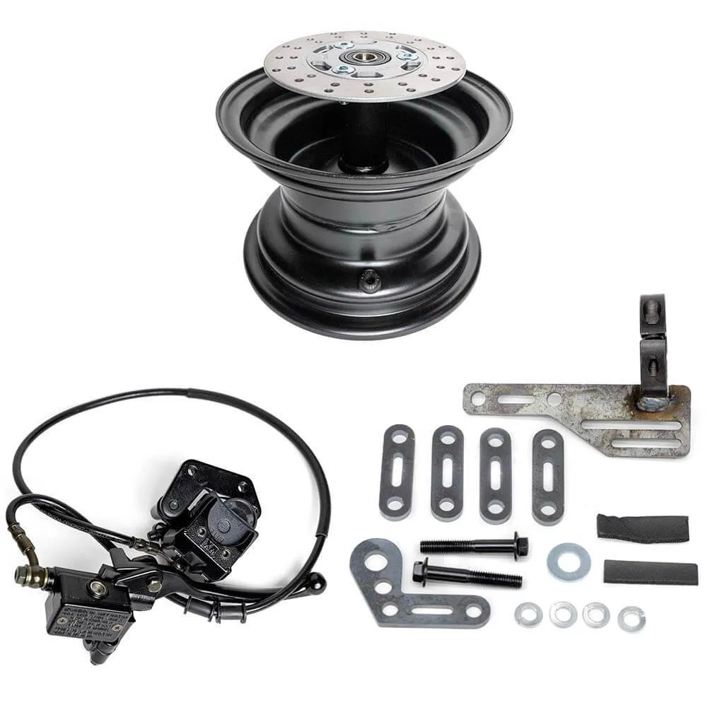 - Hydraulic brake kit: Master cylinder, brake caliper, 34″ brake hose, pre-pumped and ready to install